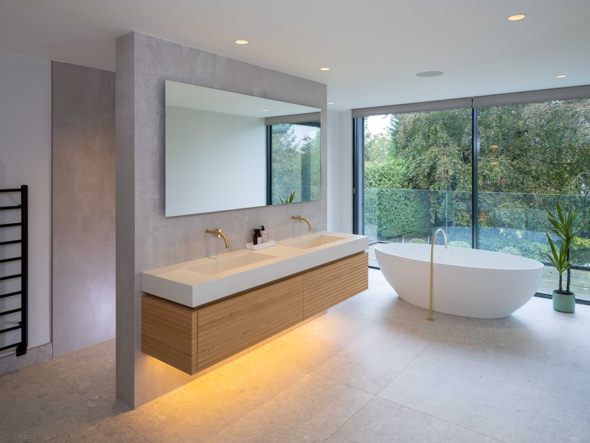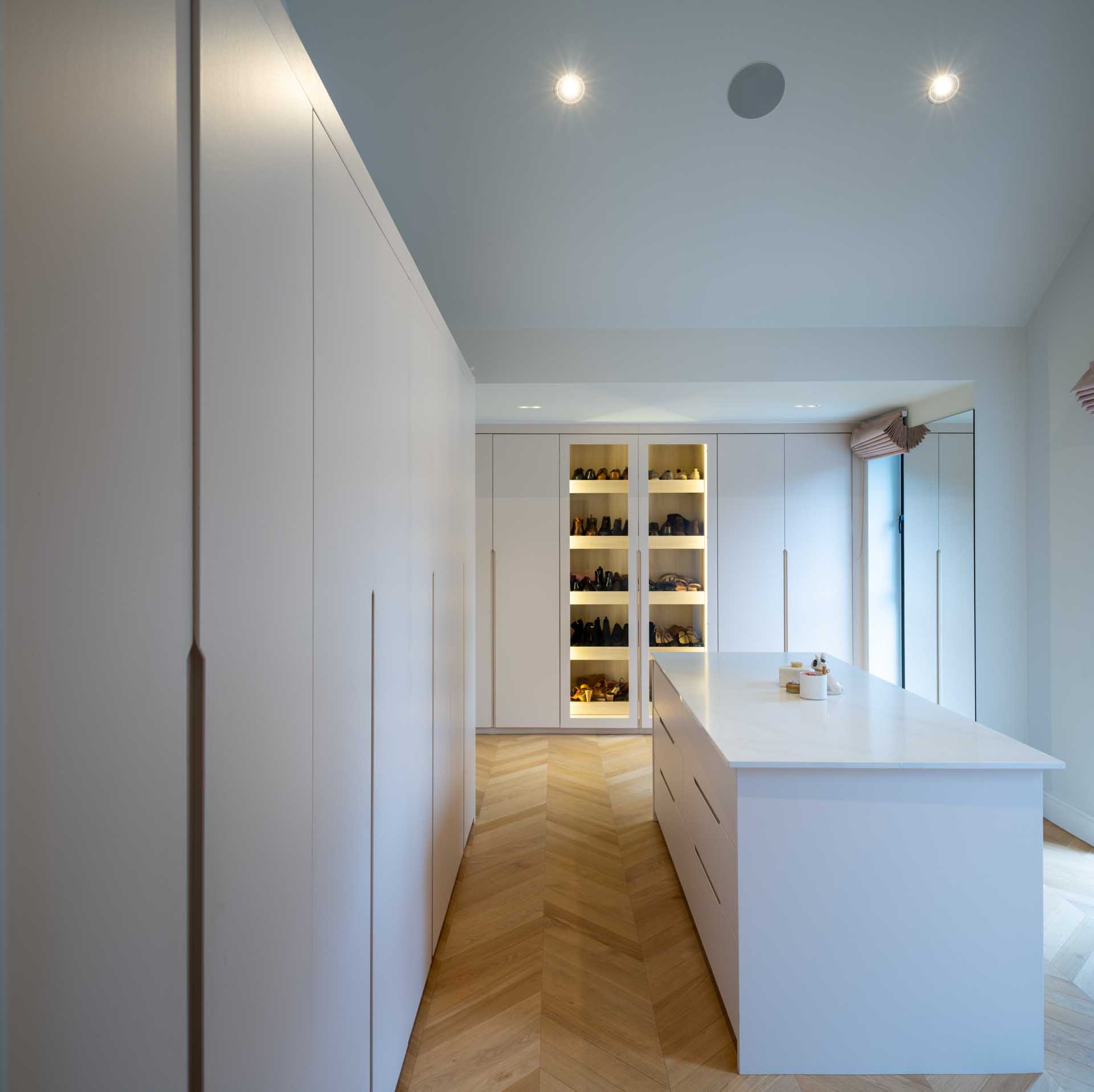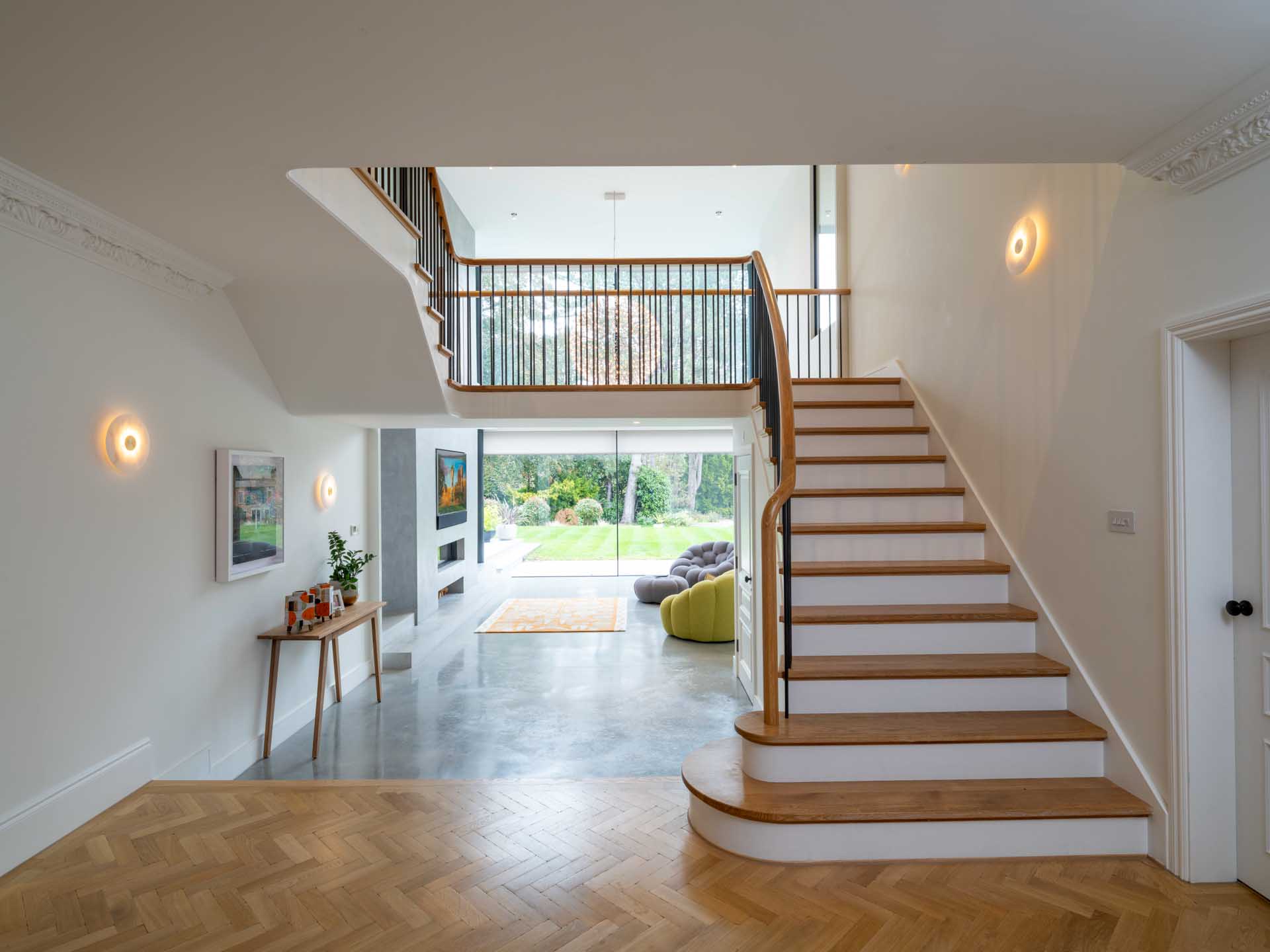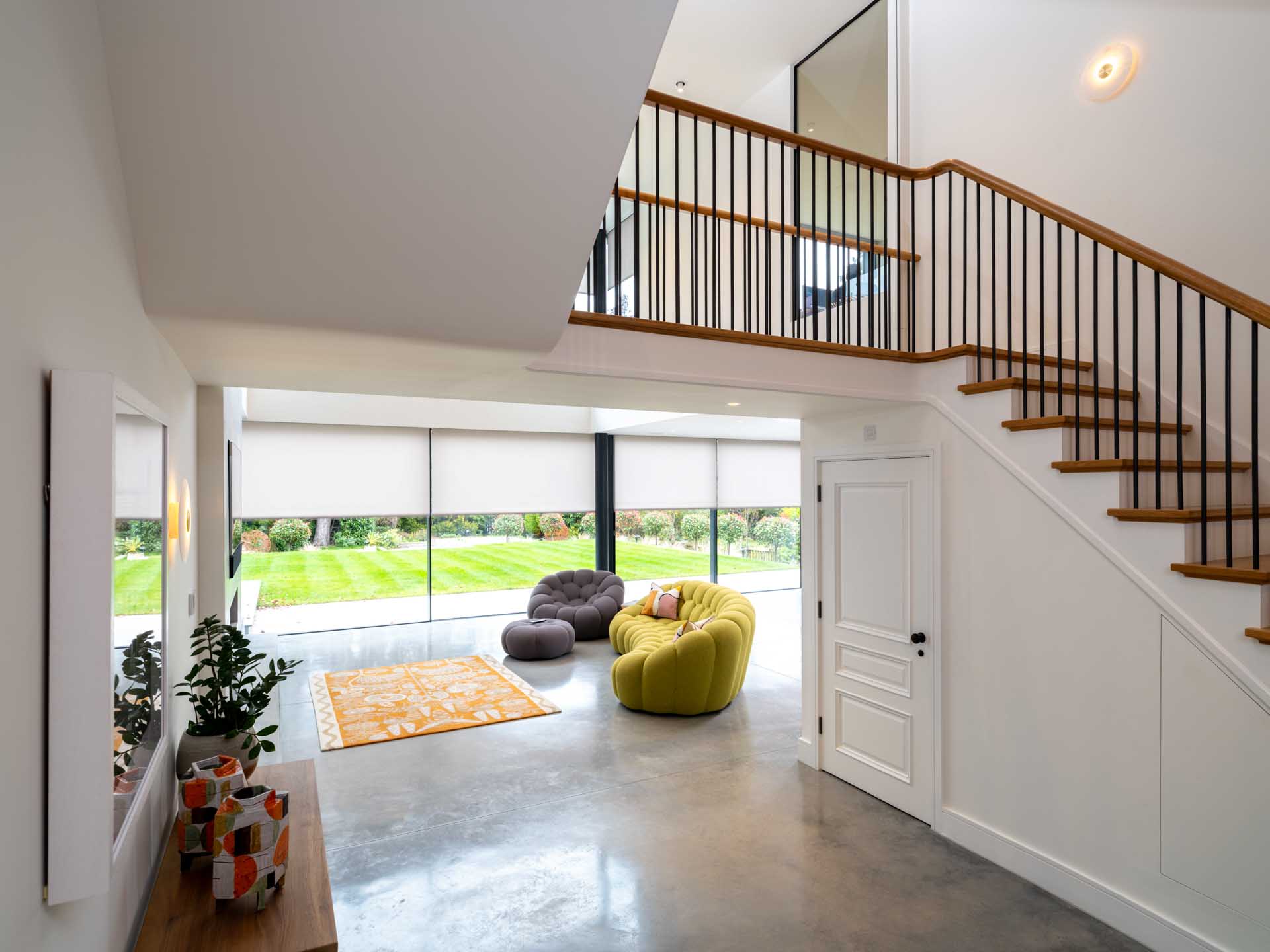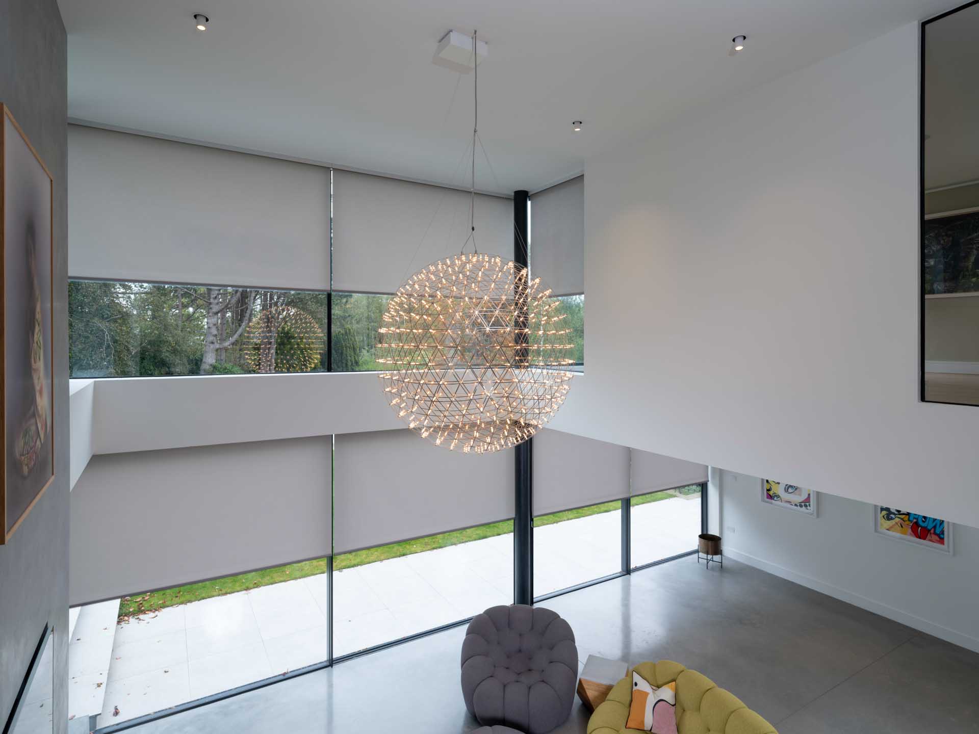 A Lutron lighting control system makes it simple to control lighting both inside and outside the home, from intuitive keypads, and automatically based on how light it is outside. This control system is focussed on the key areas of the home, with conventional switching in less important rooms. Motorised window treatments offer both security, privacy and a cosier feel once the sun has set, softening the overall look of the space.