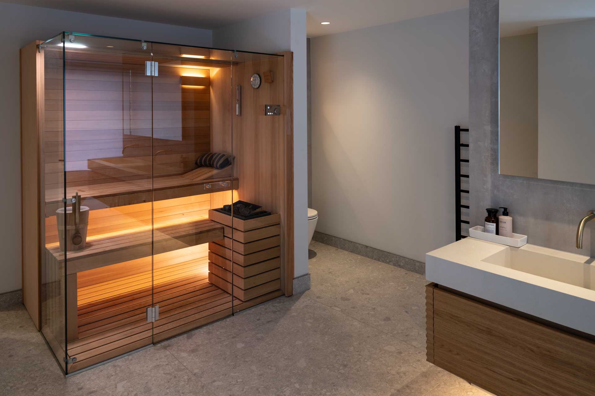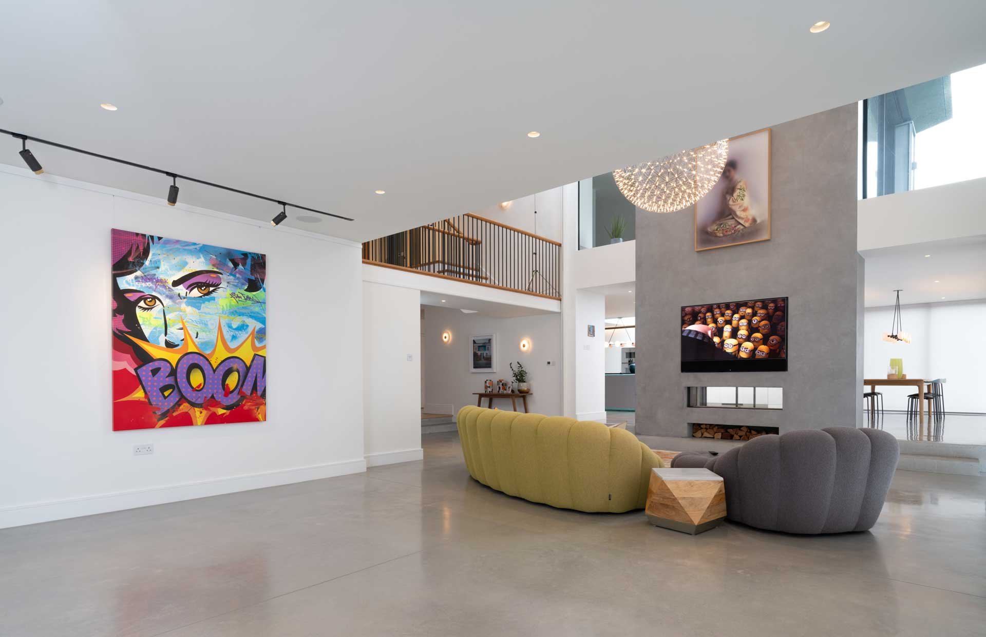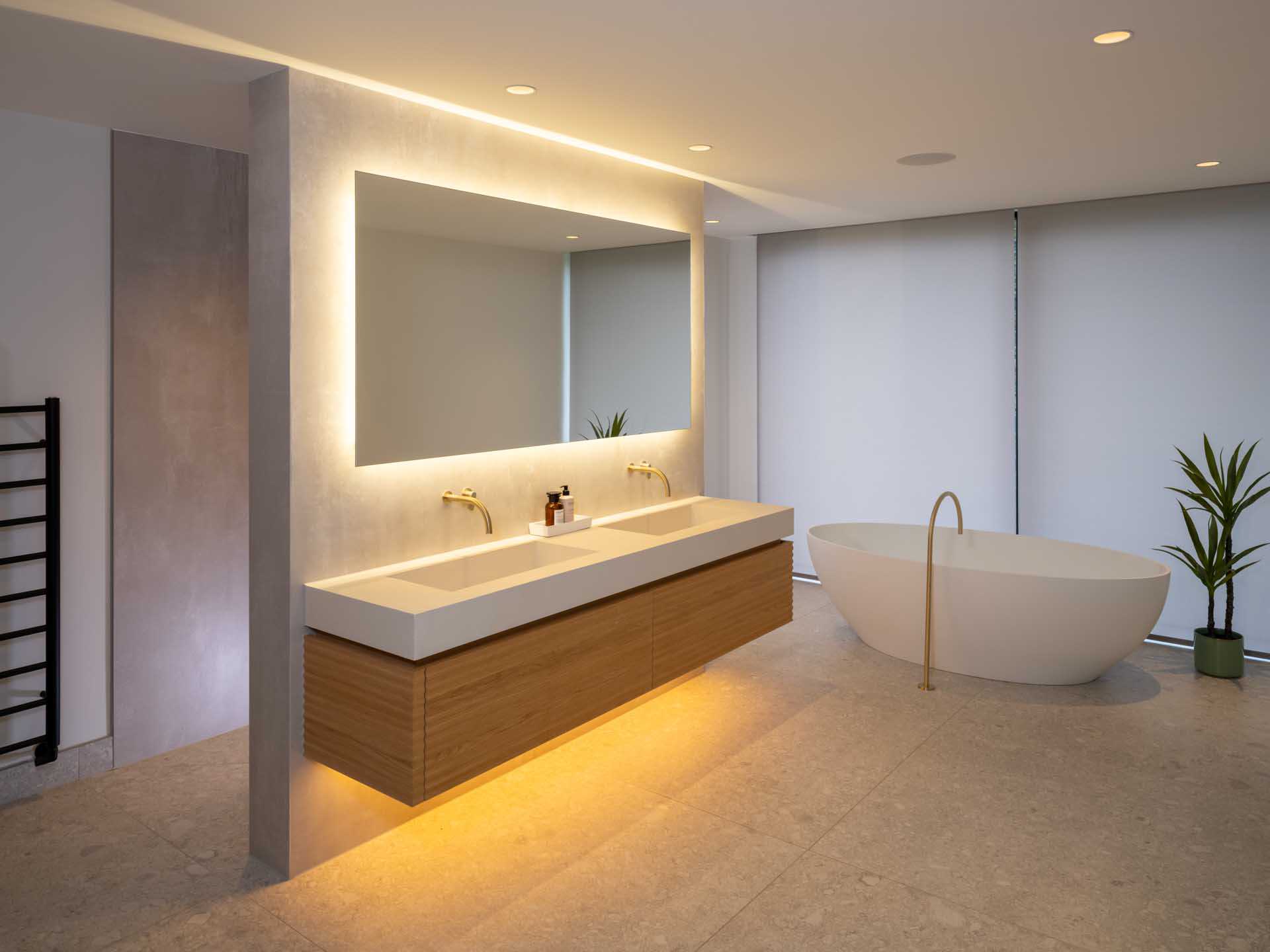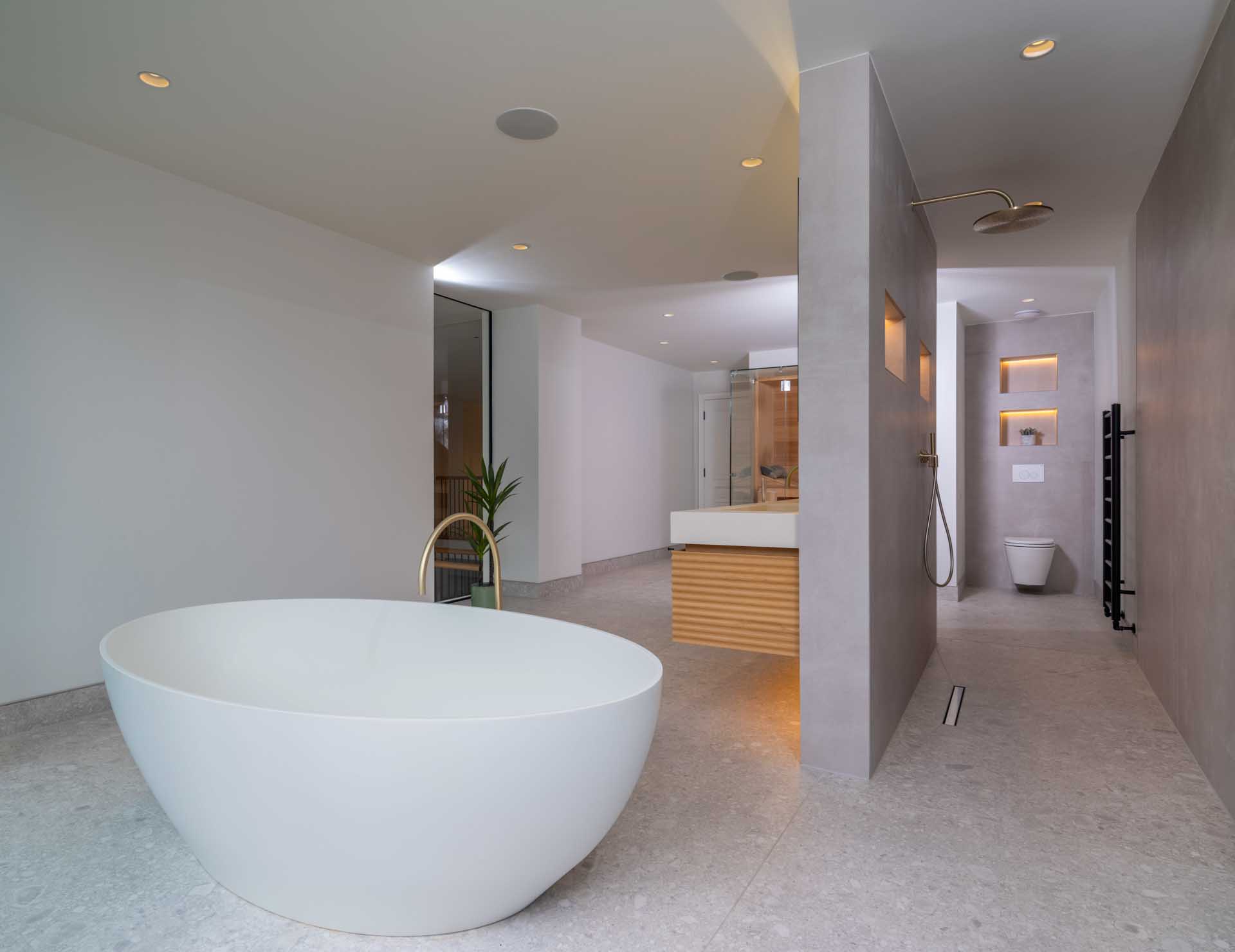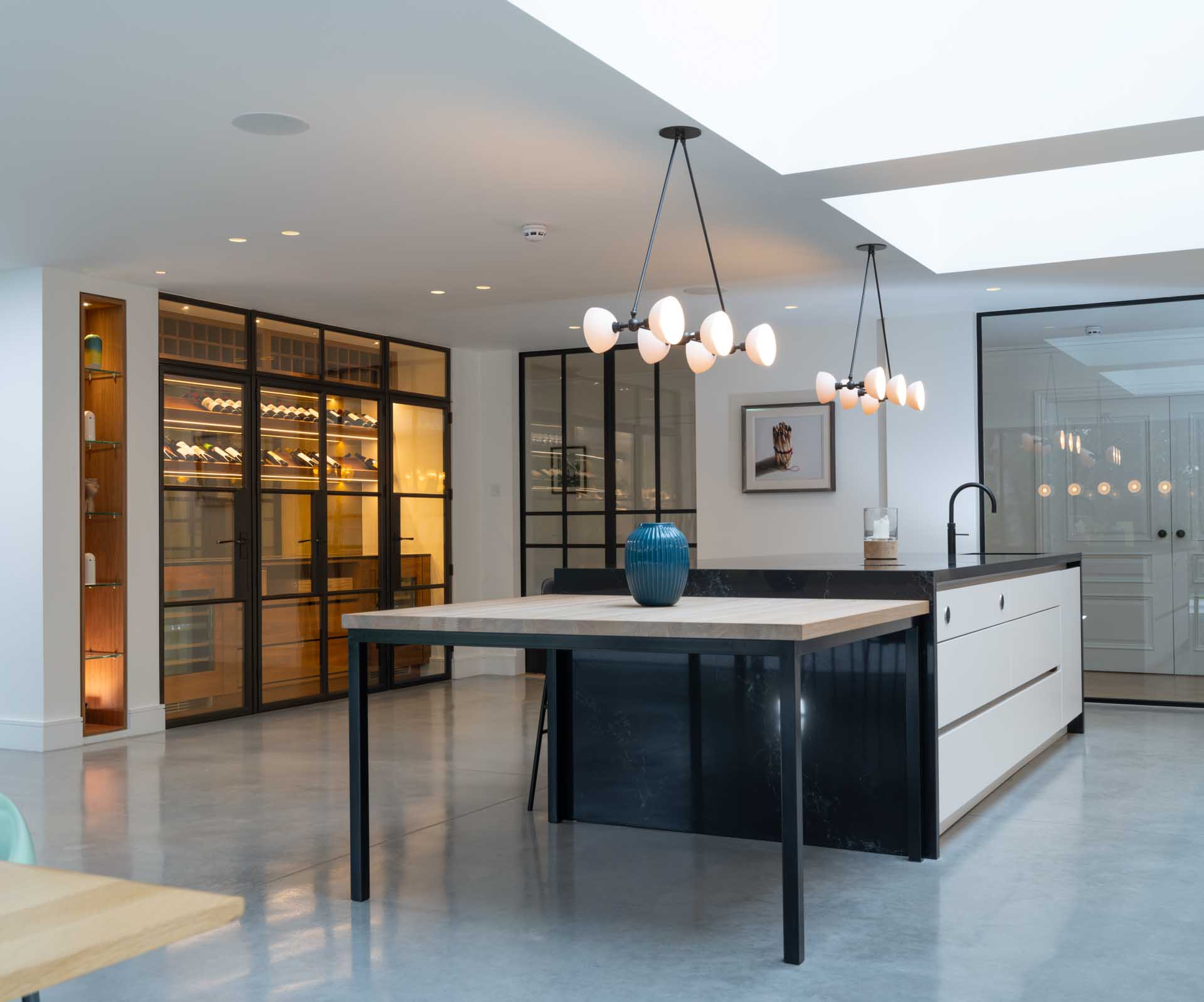 A Lutron lighting control system makes it simple to control lighting both inside and outside the home, from intuitive keypads, and automatically based on how light it is outside. This control system is focussed on the key areas of the home, with conventional switching in less important rooms. Motorised window treatments offer both security, privacy and a cosier feel once the sun has set, softening the overall look of the space.