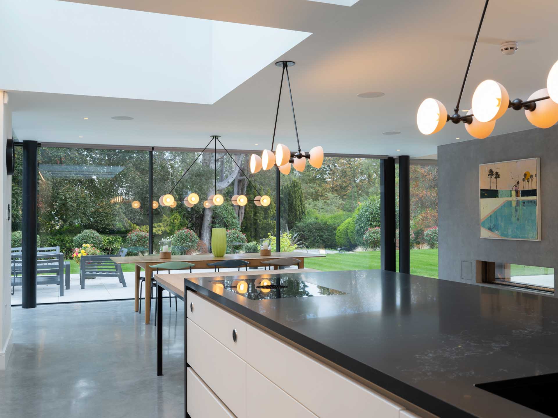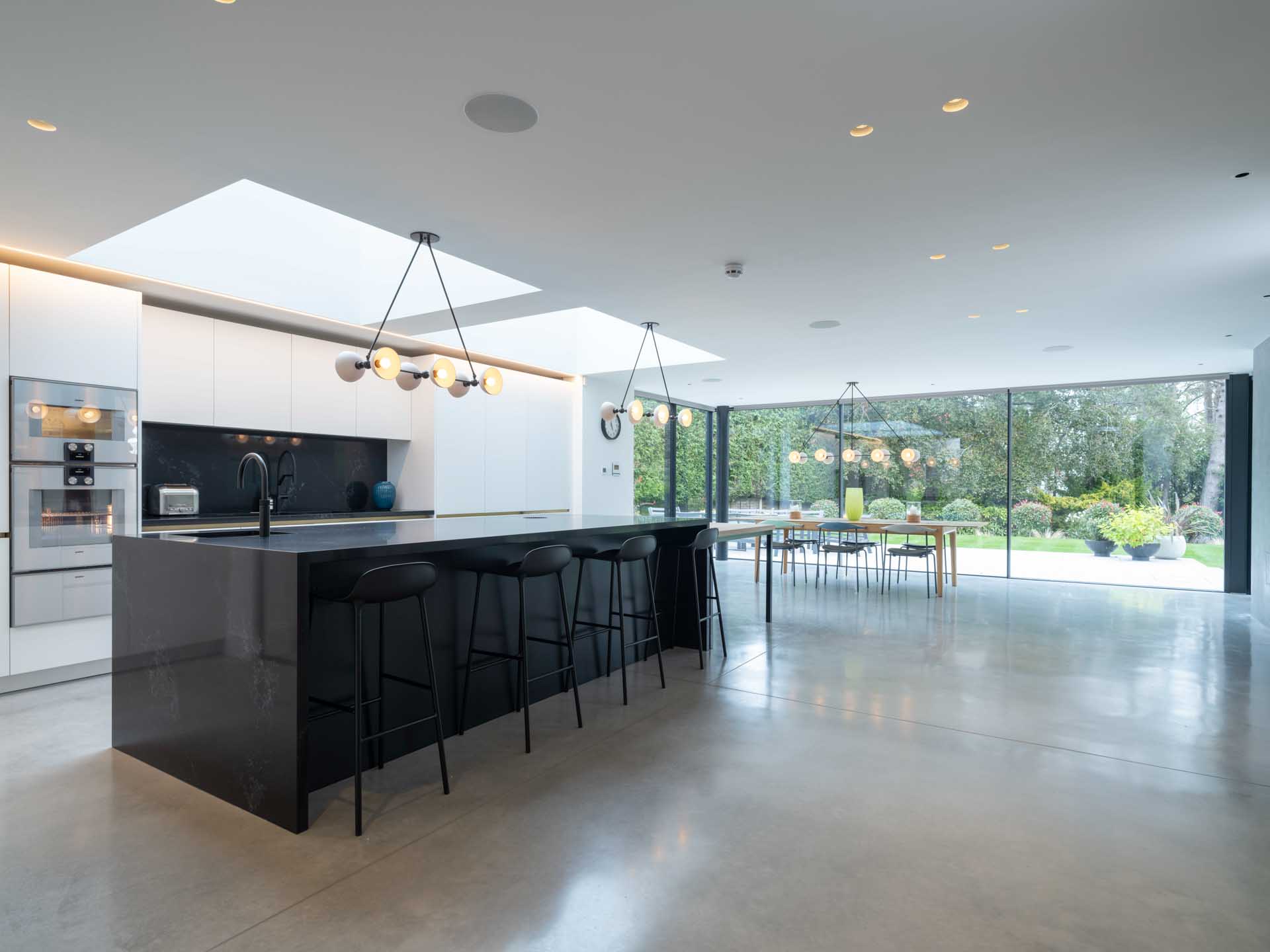 We designed and installed a simple to use audio-visual package, with two room of immersive surround sound, with ceiling speakers used everywhere else, allowing music to be streamed or wirelessly cast with ease. The entertainment system wasn’t limited to the house; outdoor speakers enveloping the main entertaining space in the garden ensure an even, focussed coverage of sound, even for large groups of guests.